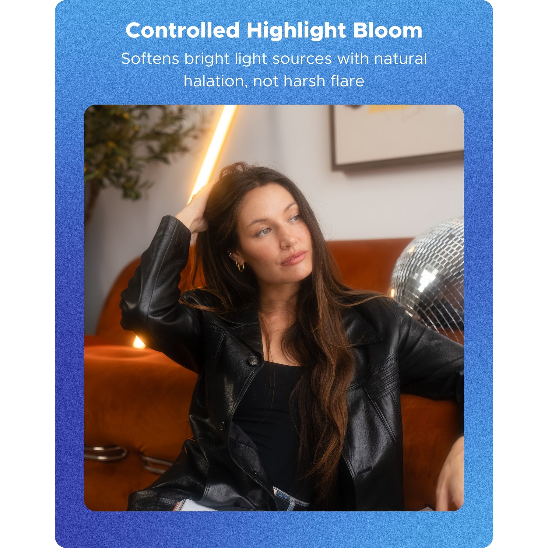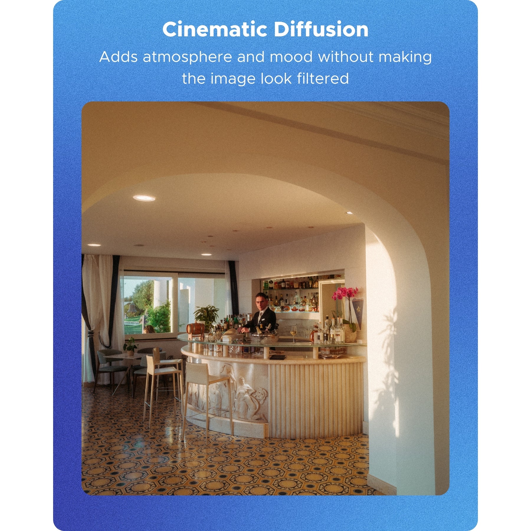 Highlights bloom more prominently, wrapping light sources in a soft, cinematic glow while gently smoothing harsh edges. The diffusion remains controlled and even, preserving the overall structure of the image while adding depth and mood.