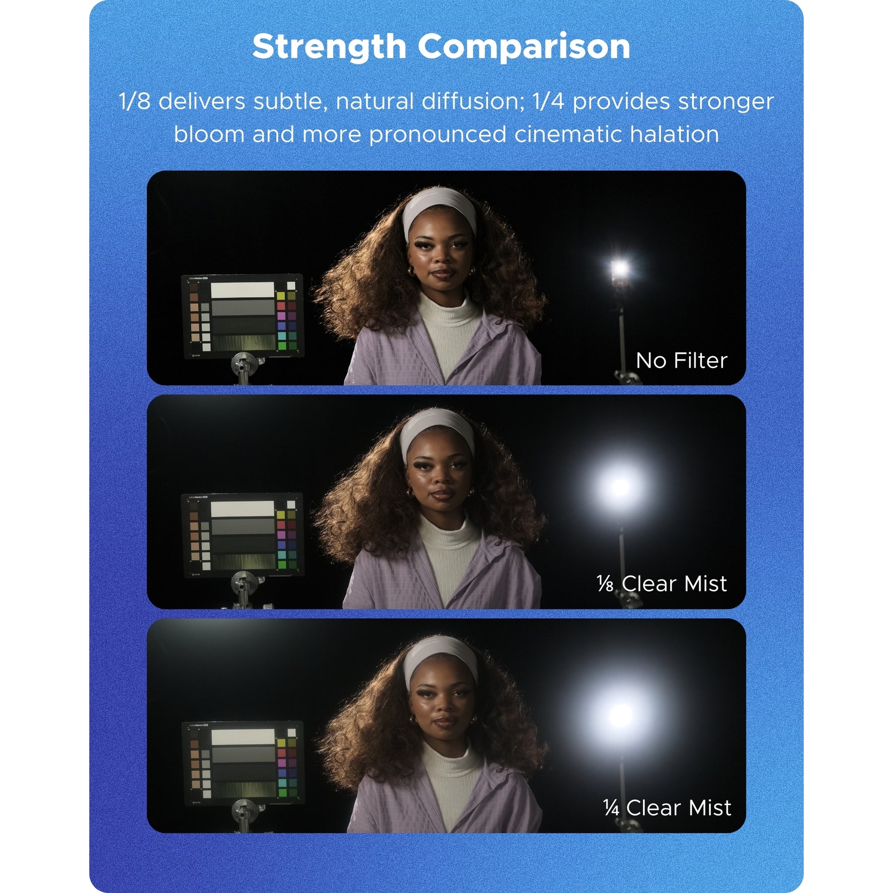 The CinePro HD Clear Mist 1/4 filter delivers a more expressive, dream-like cinematic look by noticeably enhancing halation throughout the scene. Compared to the 1/8 strength, the 1/4 diffusion creates a stronger atmospheric glow, making it ideal for creative portraits, backlit scenes, and video when you want the diffusion effect to be clearly visible.