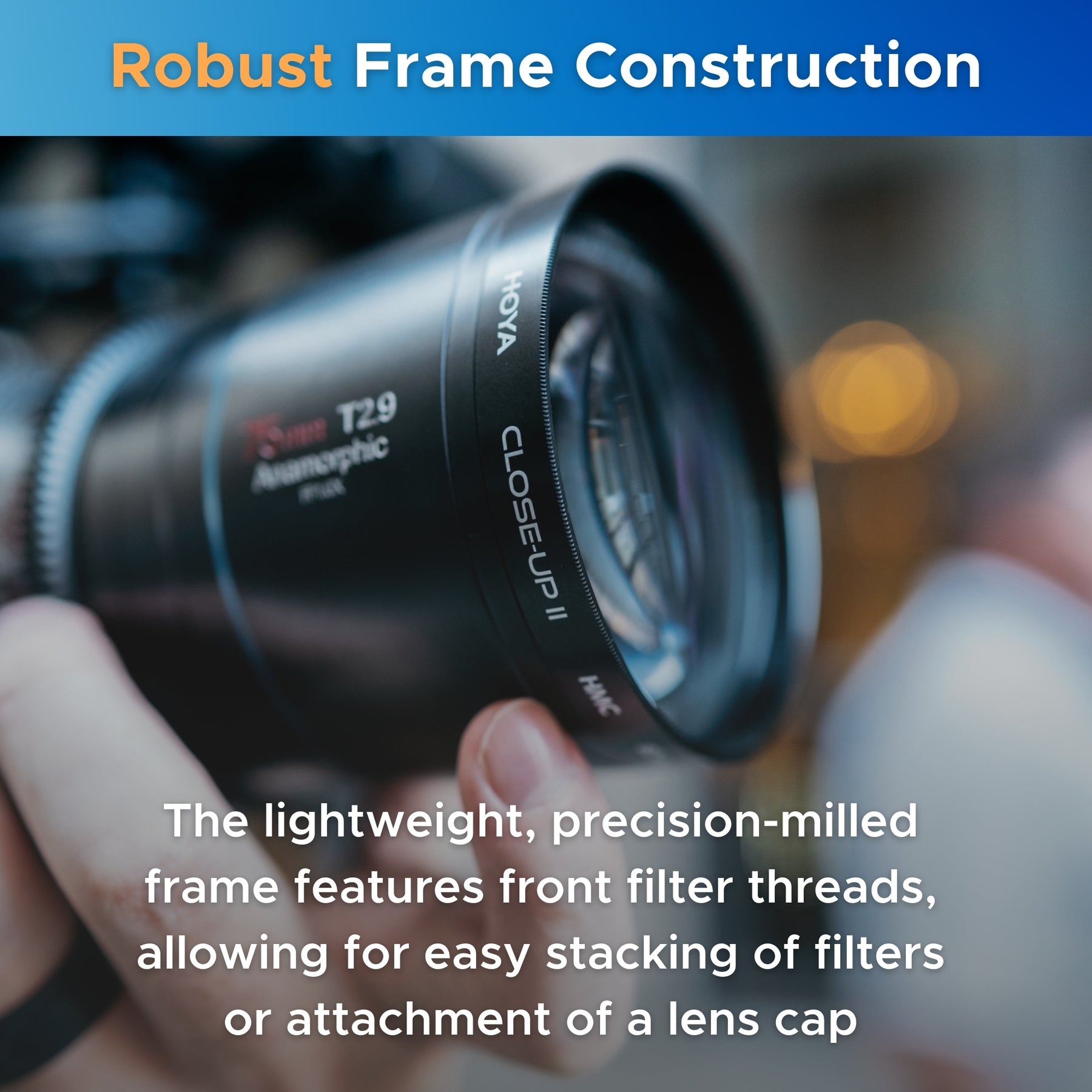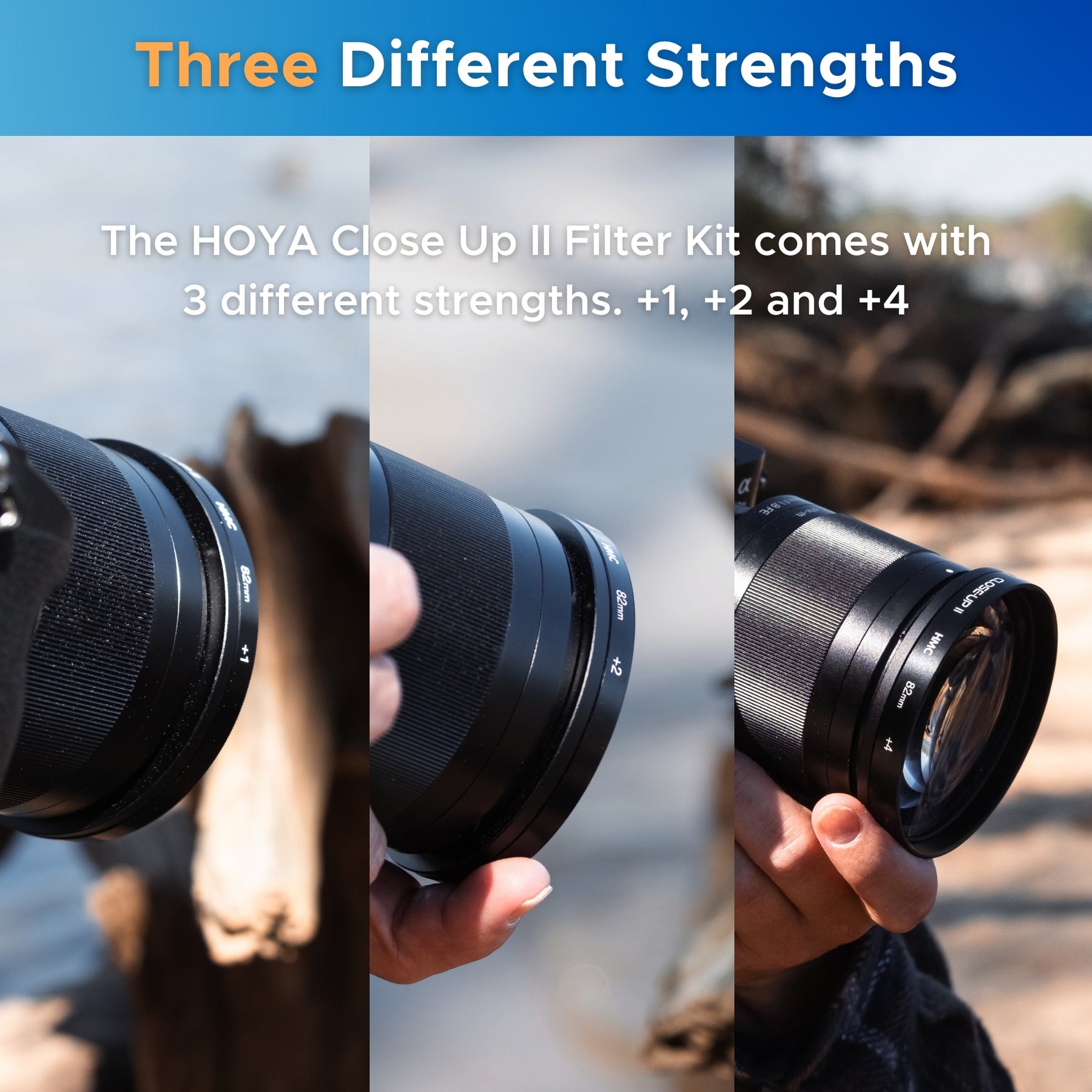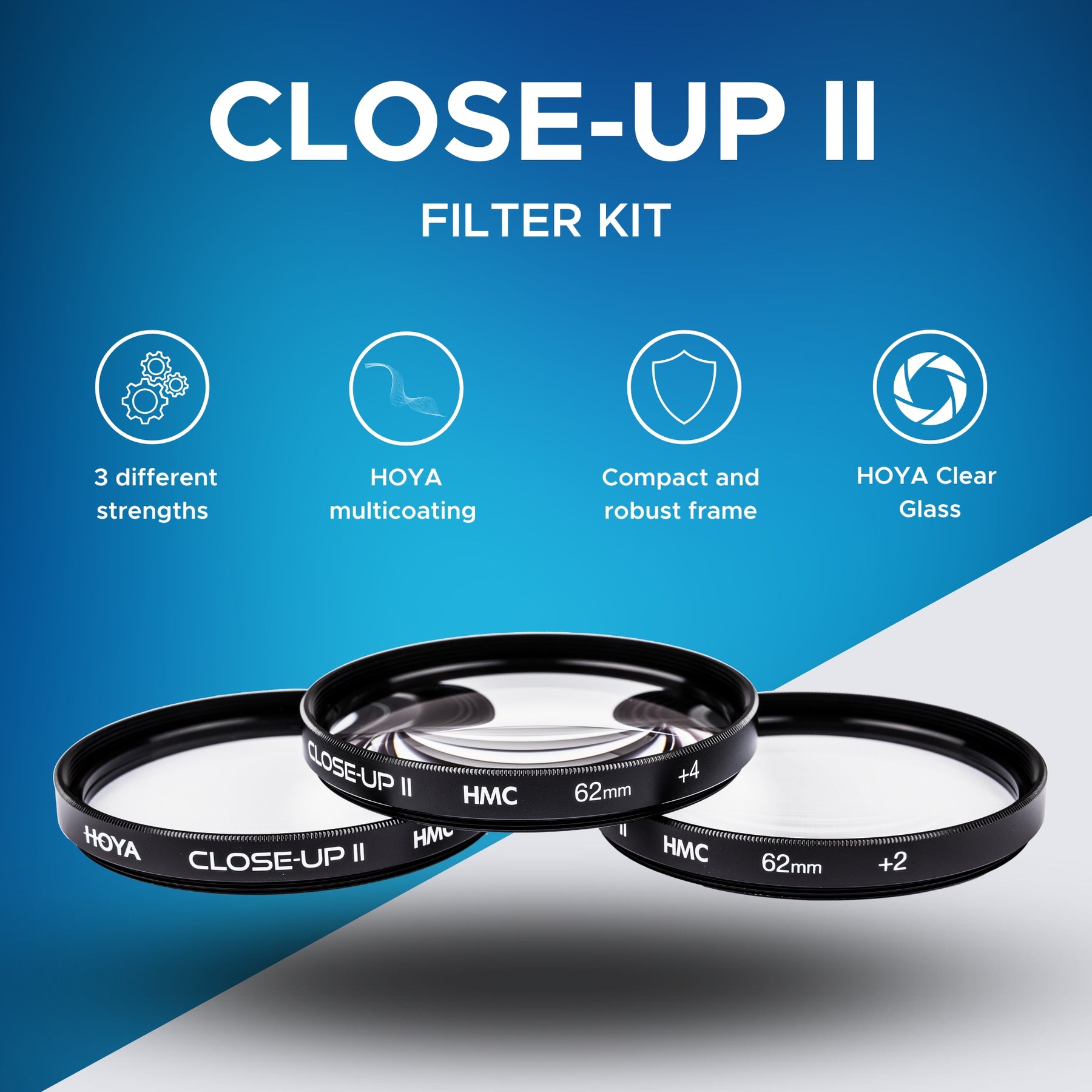 HOYA CLOSE-UP Lens Set II is a convenient kit of 3 multi coated close-up lens No.1, No. 2 and No.4 for macro photography using either digital or film cameras. Completely clear optical lens element inside light aluminum frame will let you get closer to the object.