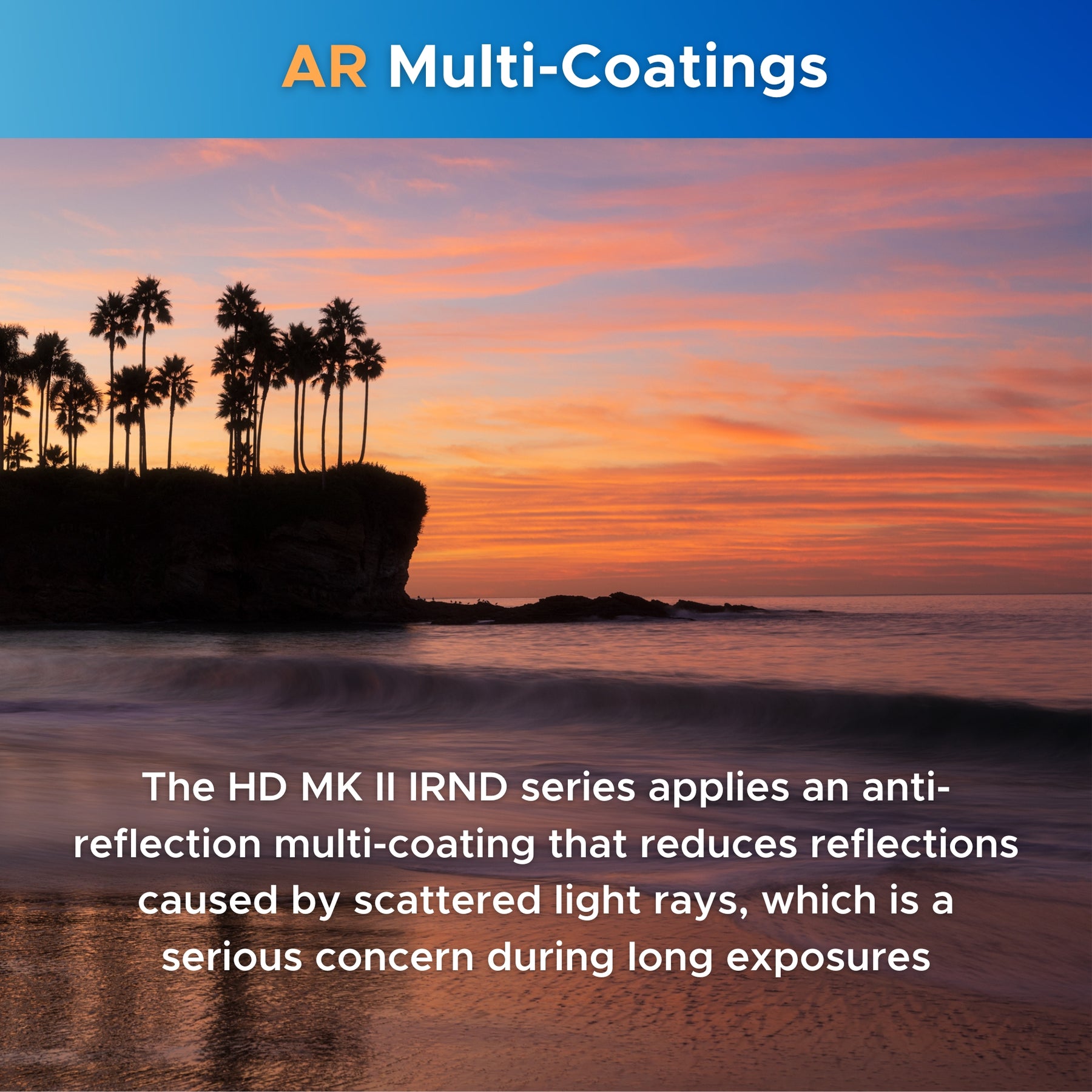 The HD MK II IRND series applies an anti-reflection multi-coating that reduces reflections caused by scattered light rays, which is a serious concern during long exposures. A waterproof and oil repellent top-coat is applied for easy cleaning and maintenance.