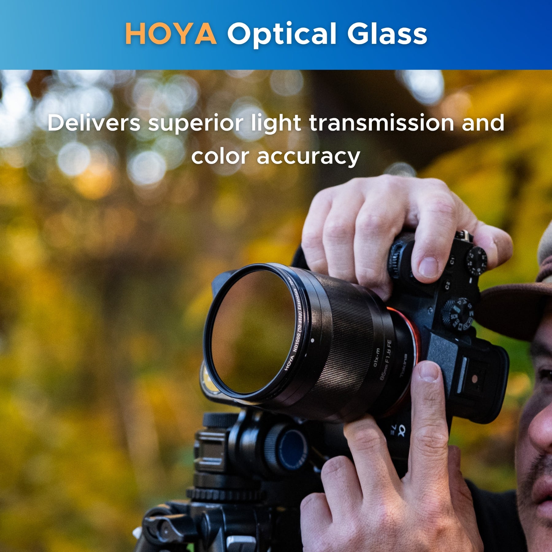 Each filter reduces the amount of light entering the lens by 3, 6, or 10 stops, making it easy to create smooth motion effects, balance exposures, or shoot wide open in bright conditions. Built with HOYA’s exclusive ND vapor deposition technology, these filters ensure consistent neutrality and natural color reproduction across the entire visible spectrum.