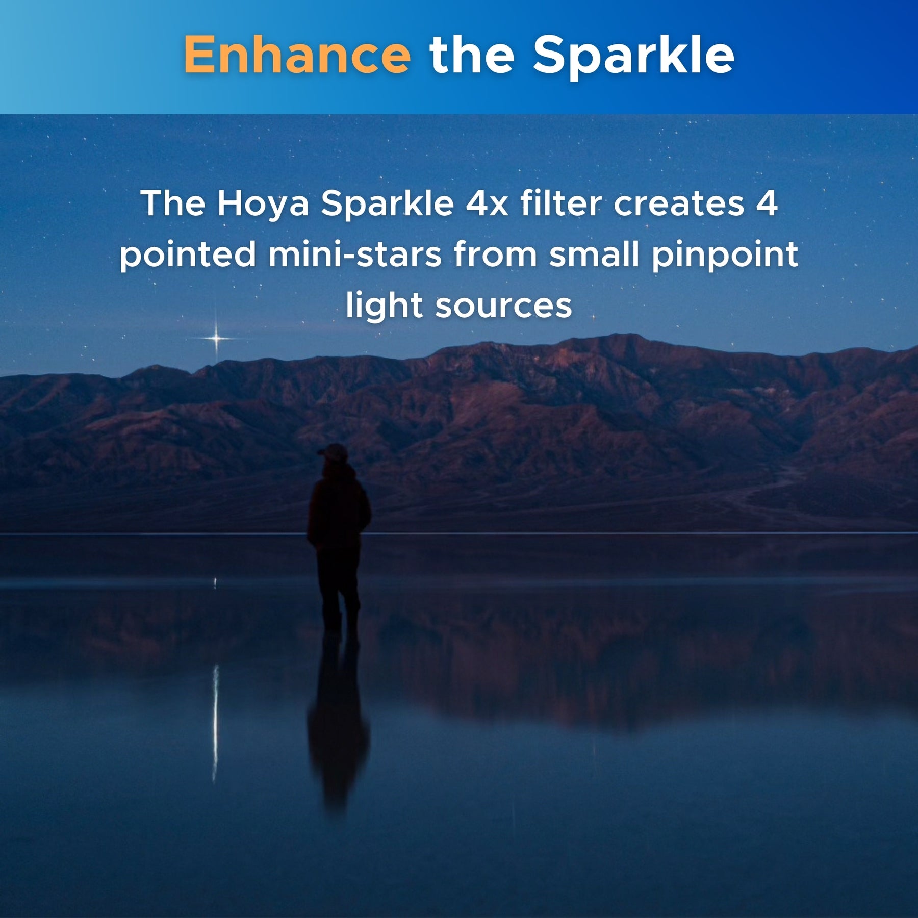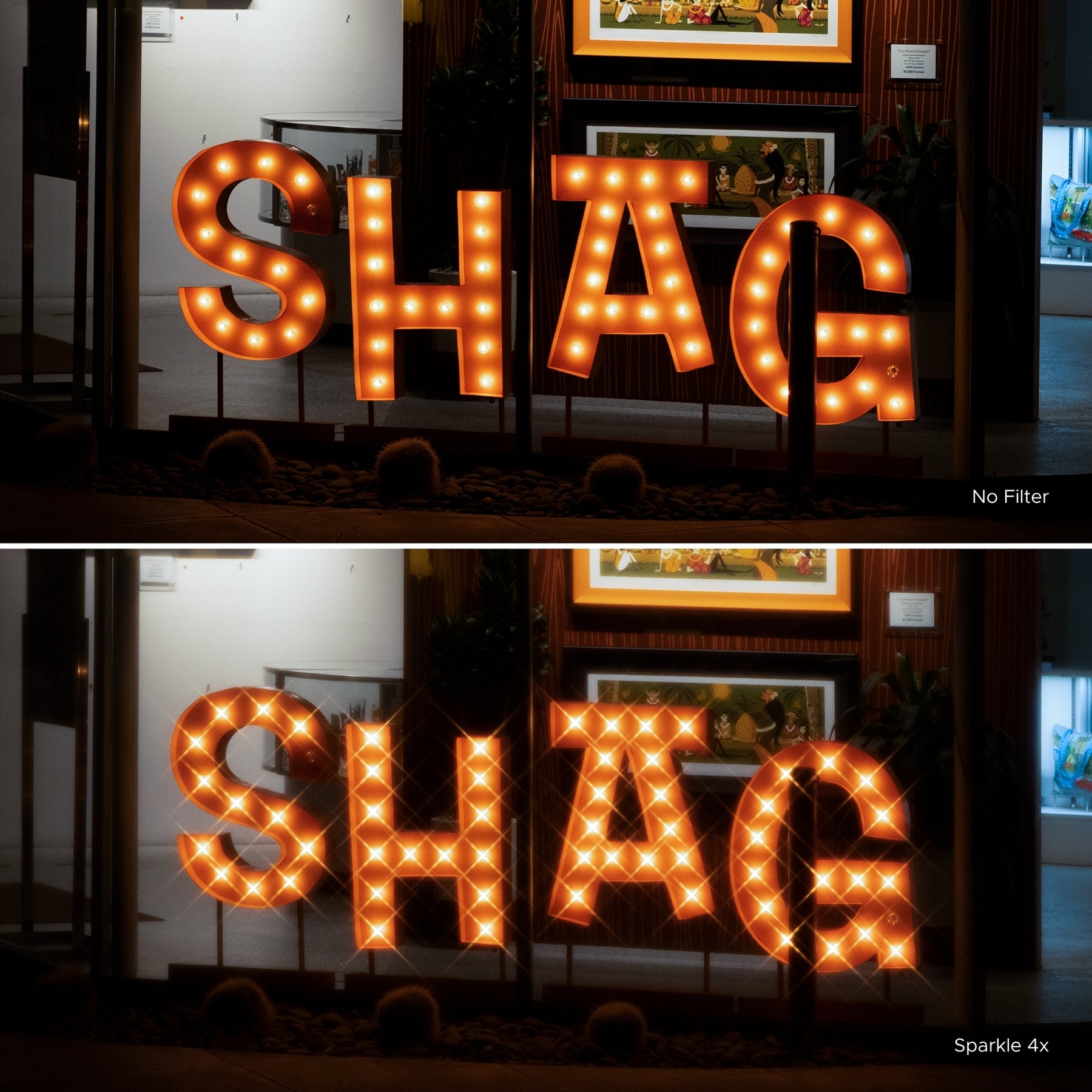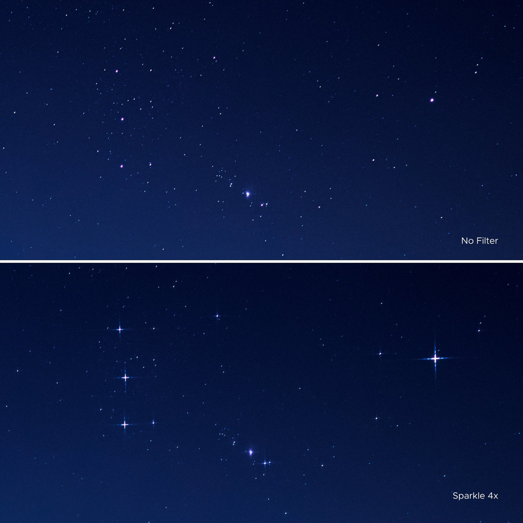 The Hoya Sparkle filter utilizes a new multi-coating process and etching pattern that limits the size of the star points to give it a more natural look than traditional Star Filters. The filter is more sensitive to very small light sources like stars making it an excellent choice for astrophotographers looking for a different and more creative look.  Traditional cross filters tend to lengthen the light beams from sources, creating dense illuminations that lead to overloaded imagery. The moderation of these beams is what makes the Hoya Sparkle unique.