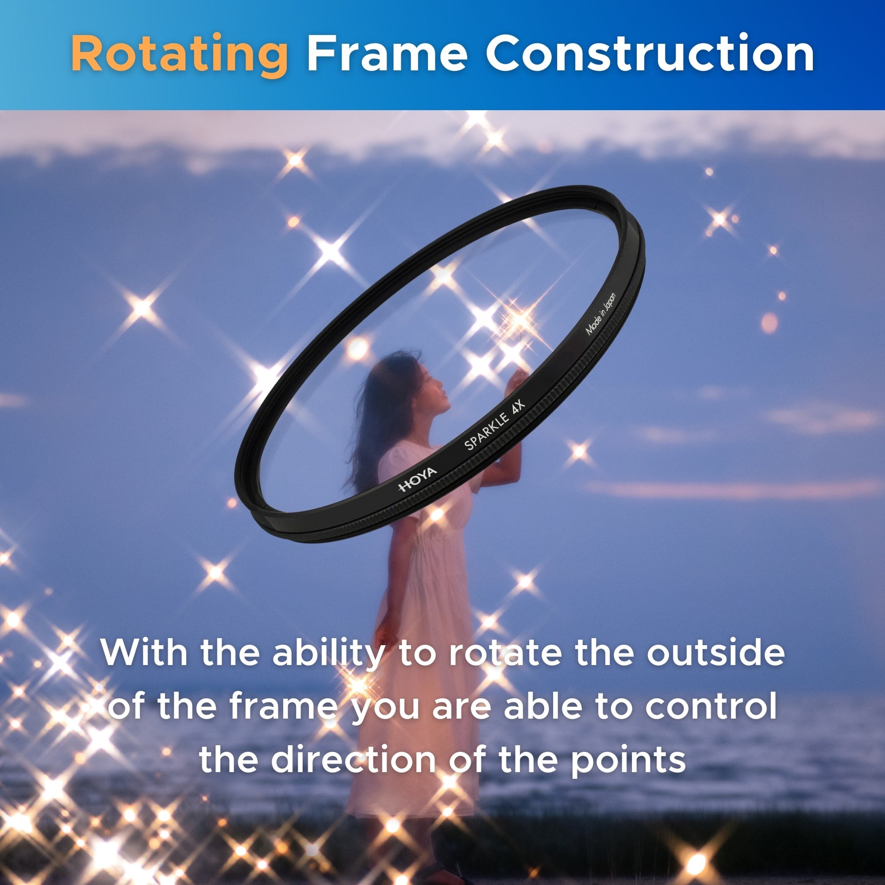 The filter's rotating frame lets you control the direction of the points emanating from light sources. The knurling on the frame make it easy to attach and remove from your lens and is matte black to minimize unwanted reflections and ghosting.