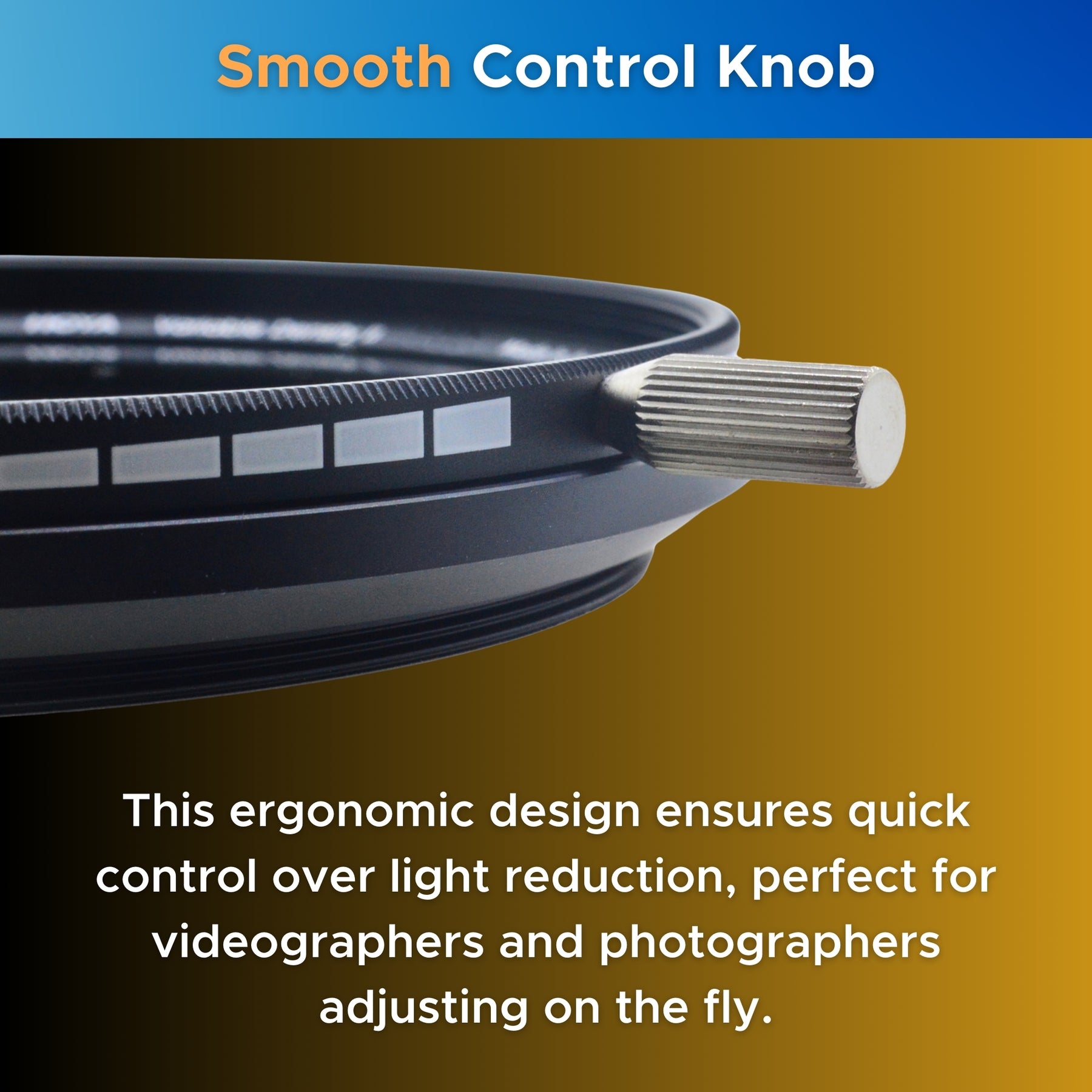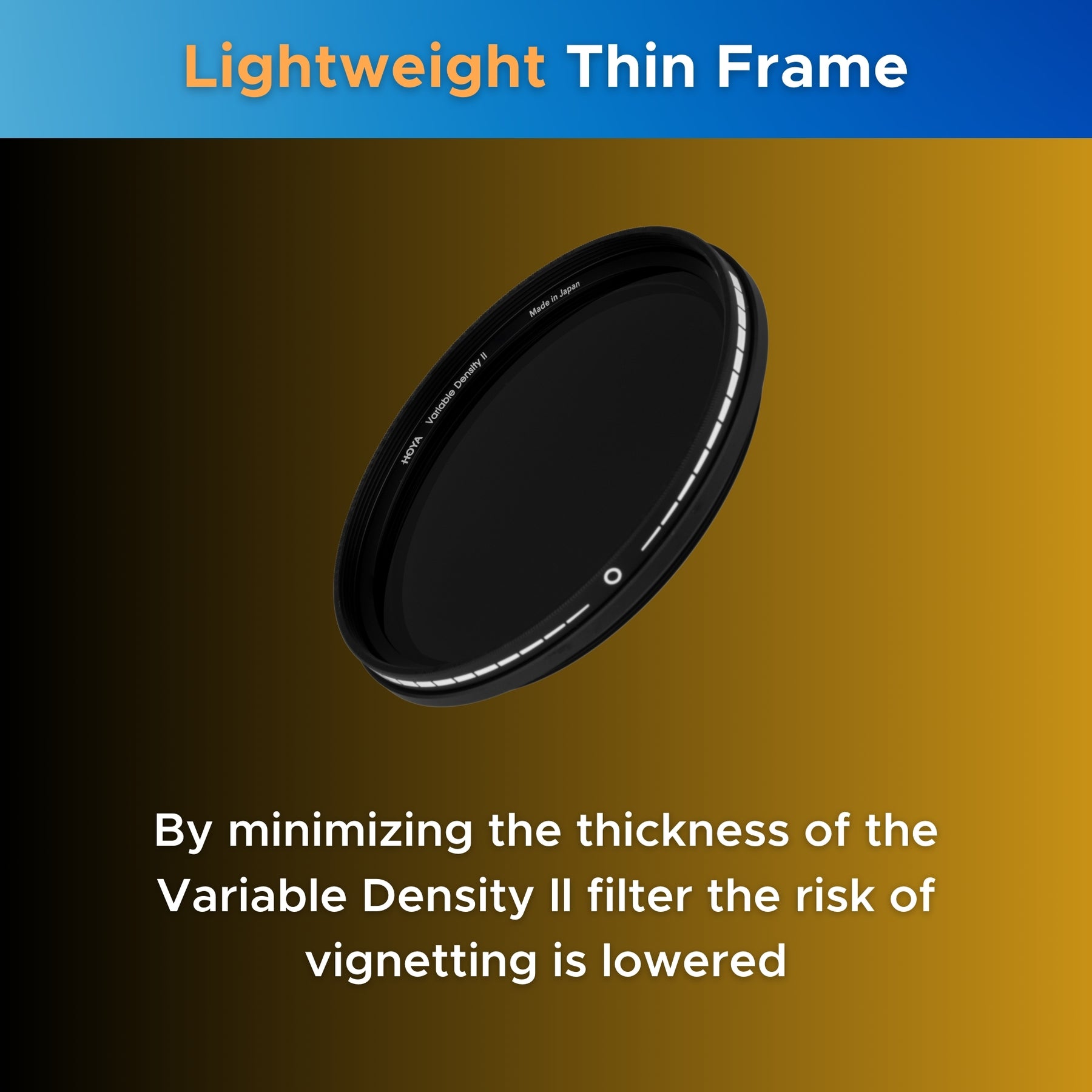The new design of the Hoya Variable Density II minimizes the vignette effect often experienced when shooting on wide-angle lenses. Hoya engineers reconstructed the Variable Density frame, minimized the overall thickness and created a top frame that is one full size bigger than the original Variable Neutral Density Filter.