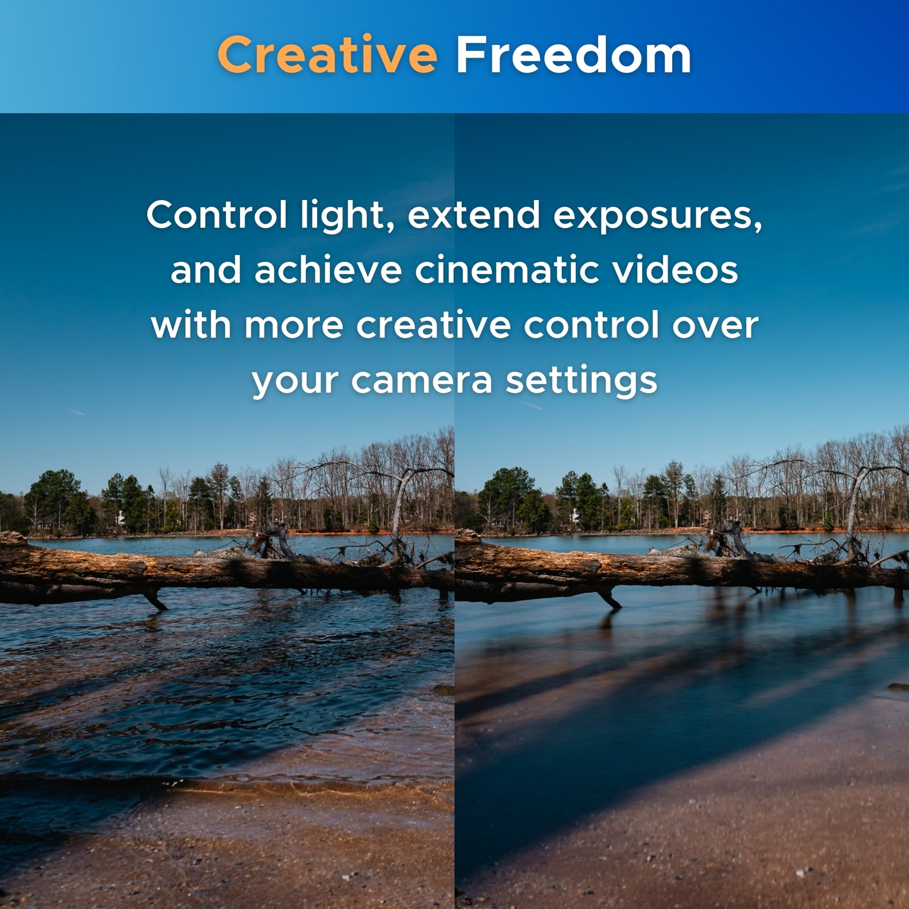 NOTE: The frame construction of the Variable Density II requires taking a lens cap that is one size bigger than the filter threads of your lens. For example, a 77mm filter would require an 82mm lens cap.