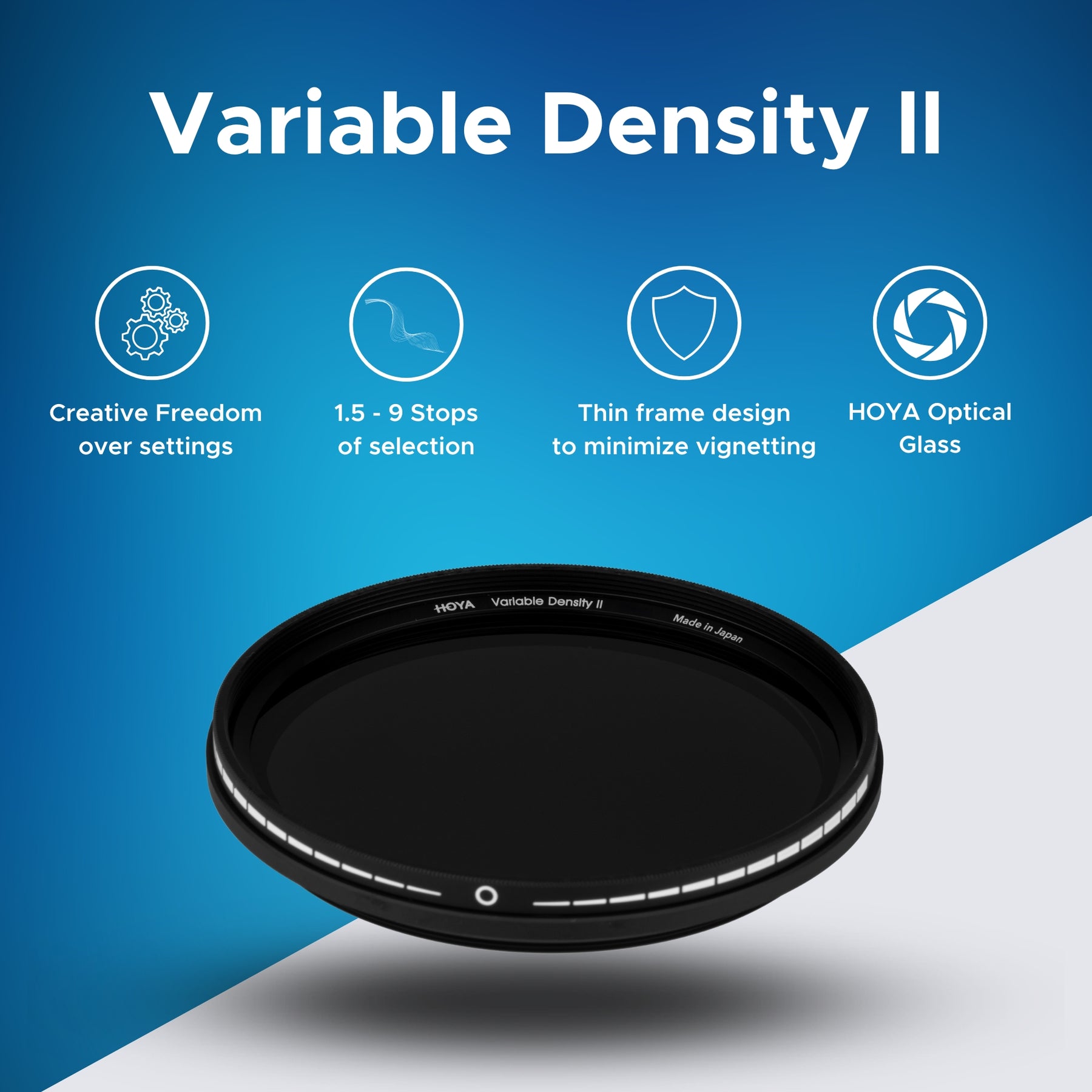 The Hoya Variable Neutral Density II Filter can be used in place of several fixed Neutral Density filters. The design of variable density filters allows you to rotate an outer frame to set the desired density the same way as a circular polarizer. A cross X pattern will occur when rotating past the minimum or maximum density range of the filter.